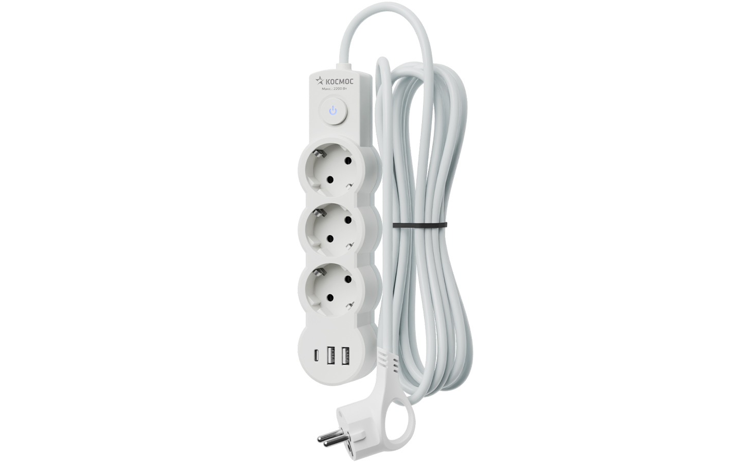 Удлинитель 2800Вт, 5м, 3 гнезда, 2USB+TYPE C , белый (Космос)